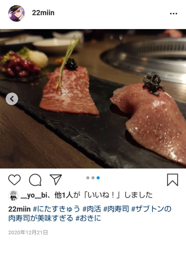 2020年12月21日、竜胆尊さんの中の人(とされるアカウント)がインスタグラムに投稿した焼肉の写真。